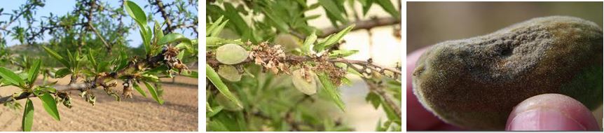 Συμπτώματα μονίλιας σε βλαστούς και καρπό αμυγδαλιάς