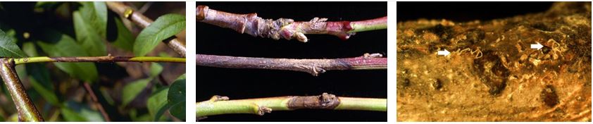 Συμπτώματα Έλκους Κλαδίσκων σε νεαρούς βλαστούς και μάζες κονιδίων εξερχόμενες από πυνκίδια έλκους