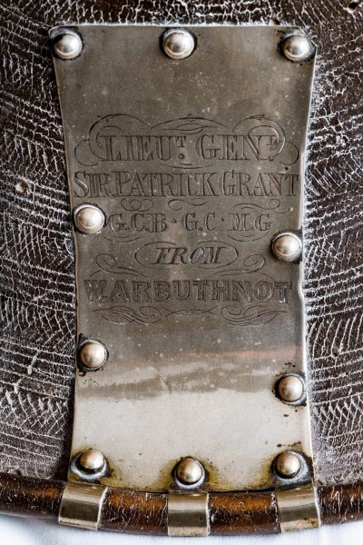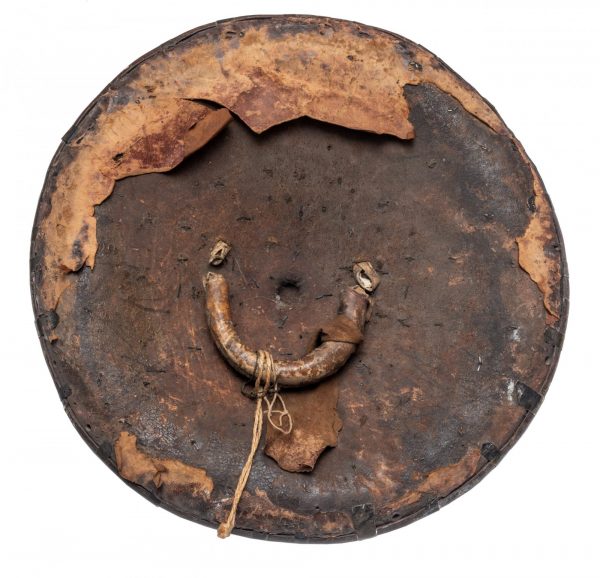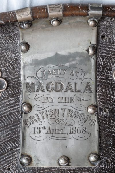 Η ασπίδα, την οποία ο οίκος δημοπρασιών περιγράφει ως «κυκλική θολωτή ασπίδα κατασκευασμένη από δέρμα και διακοσμημένη με λευκό μεταλλικό ιμάντα και φυτικά απλικέ», περιλαμβάνει μια κεντρική προεξοχή με χαραγμένη περιγραφή που γράφει: «Magdala 13th April 1868».