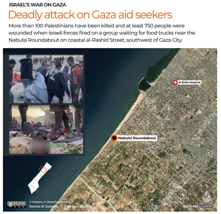 Ο ισραηλινός στρατός λέει ότι, αρχικά, αυτό που είχε συμβεί ήταν ότι τα φορτηγά με τη βοήθεια βρίσκονταν στο Ουάντι Γάζα (το σημείο όπου το Ισραήλ έχει δημιουργήσει ένα χάσμα μεταξύ του νότιου και του βόρειου τμήματος της Γάζας. Τα φορτηγά είχαν περάσει από αυτό το σημείο ελέγχου και είχαν πέσει πάνω τους χιλιάδες Παλαιστίνιοι που προσπαθούσαν να φτάσουν στα τρόφιμα και άνθρωποι συνεθλίβησαν ή και σκοτώθηκαν από τα οχήματα.
