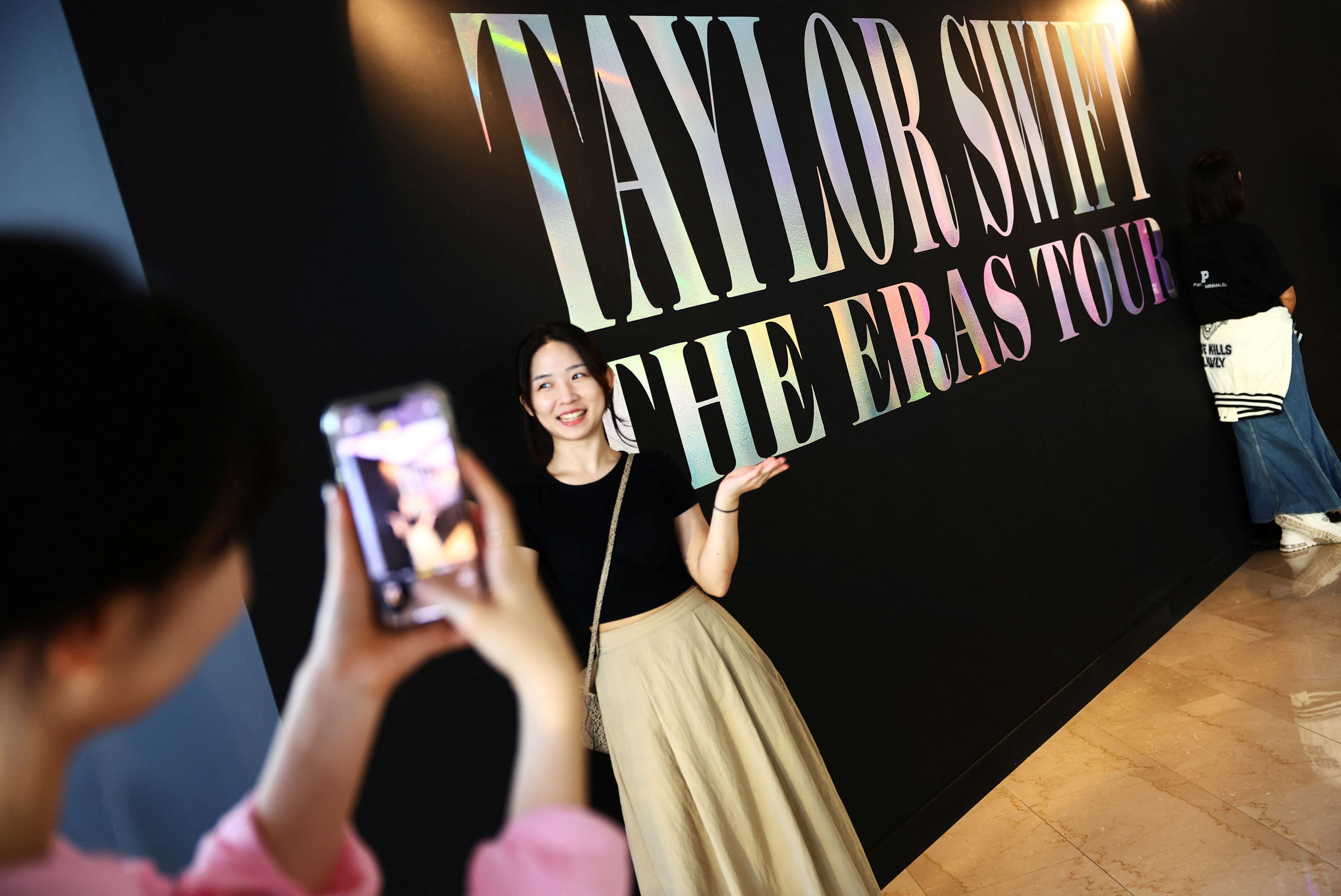 Μια νεαρή θαυμάστρια της Σουίφτ βγάζει ποζάρει μπροστά σε μια ταμπέλα της τραγουδίστριας, πριν από τη συναυλία της Eras Tour, στο The Shoppes στο Marina Bay Sands στη Σιγκαπούρη, 28 Φεβρουαρίου 2024. (REUTERS/Edgar Su).