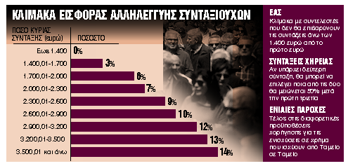 Στόχος είναι να καταστεί δικαιότερη η επιβάρυνση 400.000 συνταξιούχων, κυρίως των ΔΕΚΟ και του Δημοσίου, που εισπράττουν συντάξεις άνω των 1.400 ευρώ.