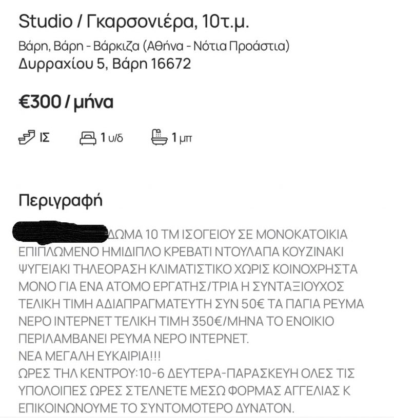 Με τη στεγαστική κρίση να έχει ήδη χτυπήσει την Ελλάδα και τη ζήτηση για ενοικίαση σπιτιού να αυξάνεται, όσο οι ιδιοκτήτες επιλέγουν να βγάζουν τα ακίνητά τους στο παζάρι του Airbnb, το κόστος των ενοικίων έχει φτάσει σε ύψη δυσθεώρητα για τους «μισθοεξαρτημένους», όπως τους είχε ορίσει ο πρωθυπουργός. Σπίτι όσο ένα κανονικό δωμάτιο ξενοδοχείου με ενοίκιο 380 ευρώ, δώμα 10 τ.με 300 ευρώ/μήνα με την αγγελία να ξεκαθαρίζει ότι απευθύνεται σε κάποιον εργάτη-τρια ή συνταξιούχο που ζει μόνος του.