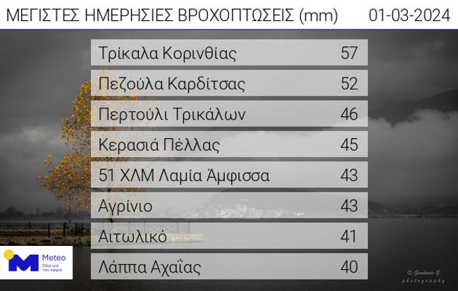 Οι 8 σταθμοί που κατέγραψαν τα μεγαλύτερα ύψη βροχής έως το πρωί της Παρασκευής 01/03