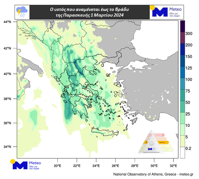 Σύμφωνα με την κατηγοριοποίηση των επεισοδίων βροχόπτωσης (Regional Precipitation Index), η οποία εφαρμόζεται από τη μονάδα Meteo του Εθνικού Αστεροσκοπείου Αθηνών, το επεισόδιο βροχόπτωσης για την Παρασκευή 01/03 κατατάσσεται στην Κατηγορία 3 (Σημαντική).