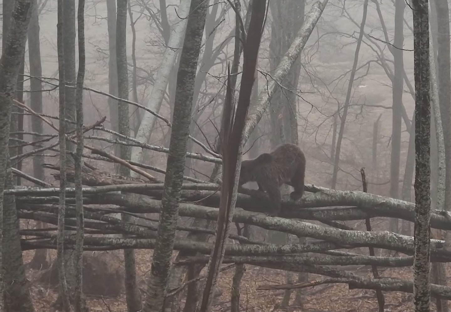 Στα εν λόγω πλάνα βλέπουμε τον «Γιώργο» όπως φωνάζουν αυτήν την αρκούδα, να έχει σκαρφαλώσει στα κλαδιά ενός μεγάλου πεσμένου δέντρου και να τα εξερευνά.