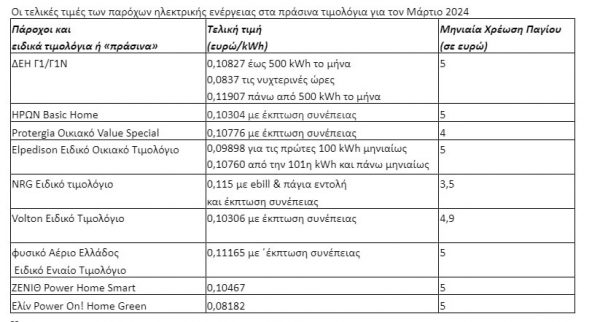 Το εύρος των τελικών τιμών προμήθειας ρεύματος (συμπεριλαμβανομένων και των όποιων πιθανόν εκπτώσεων) κυμαίνεται από τα 0,08 έως και τα 0,11 ευρώ ανά κιλοβατώρα. Τον προηγούμενο μήνα, φεβρουάριο το εύρος των χρεώσεων στα πράσινα τιμολόγια ήταν από τα 0,11 έως τα 0,14 ευρώ ανά κιλοβατώρα.