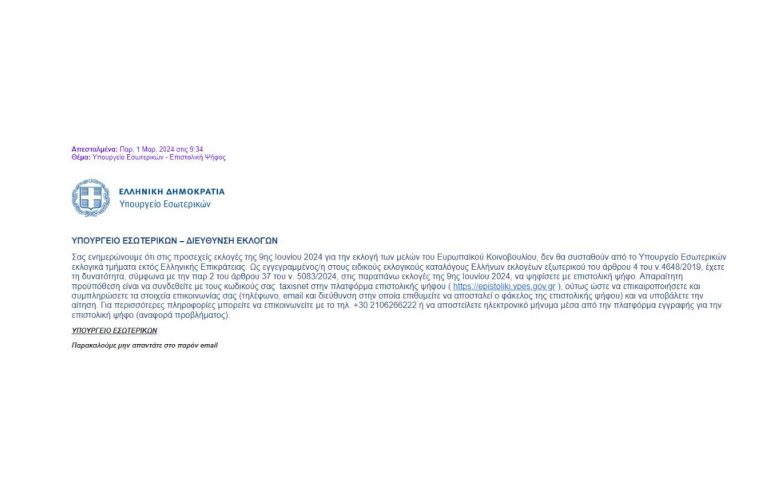 Ο προβληματισμός τους έγινε μεγαλύτερος καθώς το email αυτό ήρθε σε μικρή χρονική απόσταση από ένα email που έστειλε το υπουργείο Εσωτερικών στους 22825 Έλληνες του εξωτερικού που είχαν συμπεριληφθεί στους ειδικούς εκλογικούς καταλόγους εξωτερικού (θυμίζουμε ότι διαμόρφώθηκαν το 2023 99 εκλογικά τμήματα εξωτερικού σε 85 πόλεις 35 χωρών) και το οποίο τους ενημέρωνε για το νέο σύστημα της επιστολικής ψήφου και τους εφιστούσε την προσοχή στο ότι παρότι εγγεγραμμένοι στους ειδικούς εκλογικούς καταλόγους Ελλήνων εξωτερικού θα έπρεπε να κάνουν αίτηση στην πλατφόρμα της επιστολικής ψήφου, καθώς δεν θα συσταθούν στις Ευρωκλογές εκλογικά τμήματα εξωτερικού.