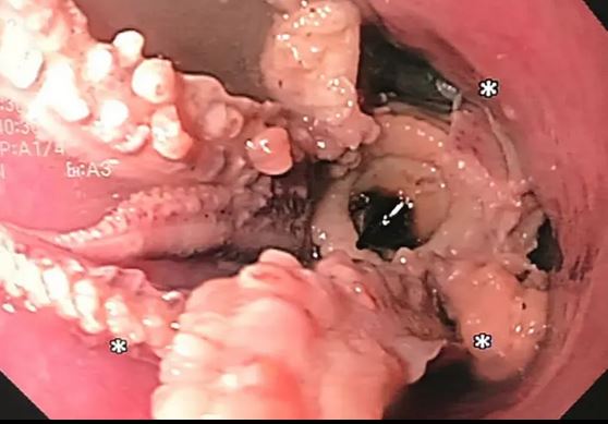 Μια επακόλουθη εξέταση έδειξε ένα χταπόδι ζωντανό με πλοκάμια να έχει σφηνωθεί δύο εκατοστά από τα όρια οισοφάγου-στομάχου. Οι γιατροί αφαίρεσαν το χταπόδι με λαβίδα.