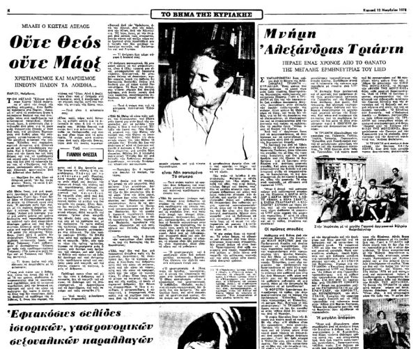 *Συνέντευξη που είχε παραχωρήσει ο Κώστας Αξελός στο δημοσιογράφο και συγγραφέα Γιάννη Φλέσσα το Νοέμβριο του 1978, στο Παρίσι. Είχε δημοσιευτεί στην εφημερίδα «Το Βήμα» την Κυριακή 12 Νοεμβρίου 1978 υπό τον τίτλο «Ούτε Θεός ούτε Μαρξ».