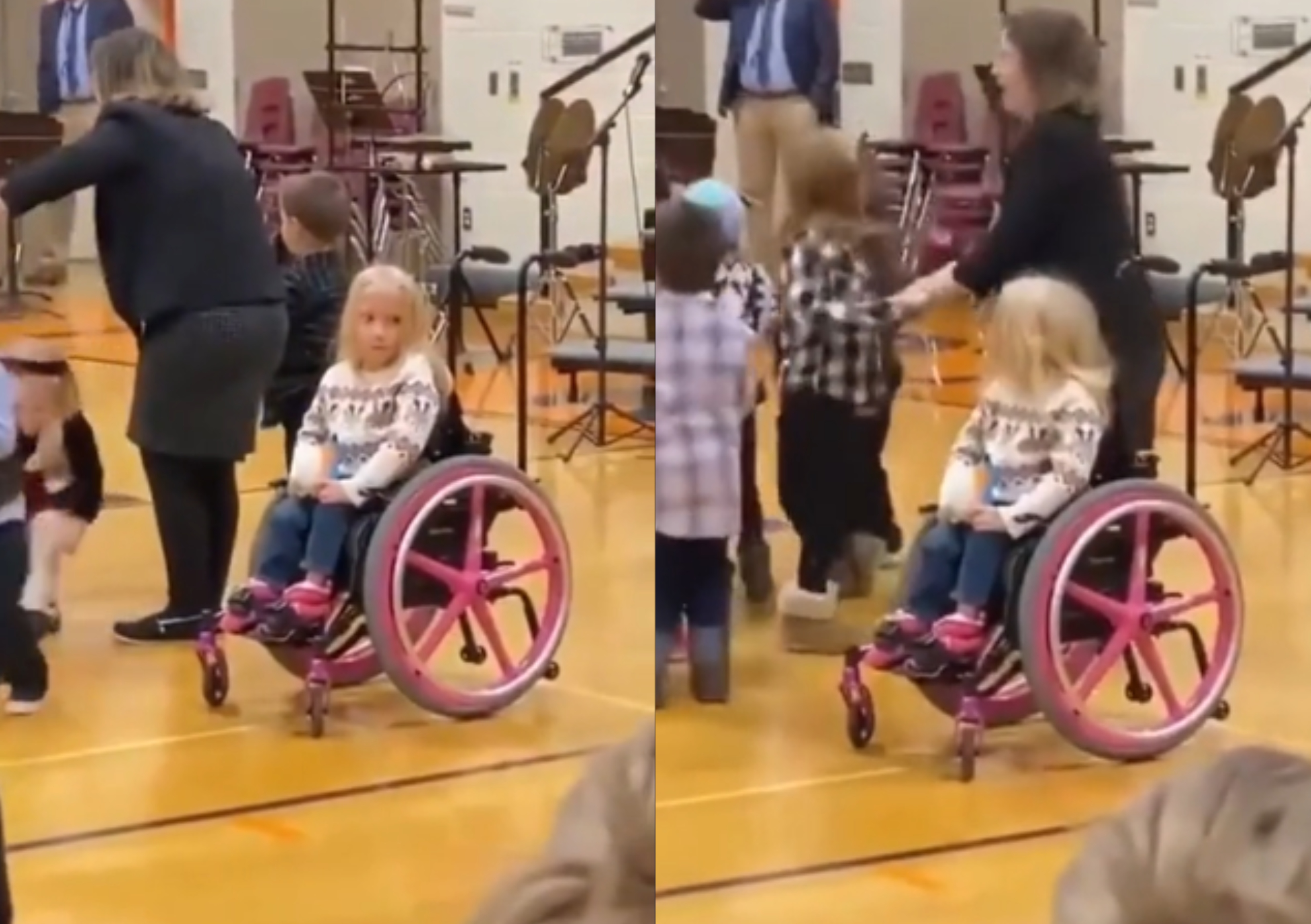 Τα υπόλοιπα παιδιά τραγουδούσαν και χόρευαν μαζί στον κύκλο, ενώ το κοριτσάκι στο αναπηρικό αμαξίδιο καθόταν στο ίδιο σημείο όλη την ώρα, κοιτάζοντας τους συμμαθητές της να διασκεδάζουν και να χαίρονται.
