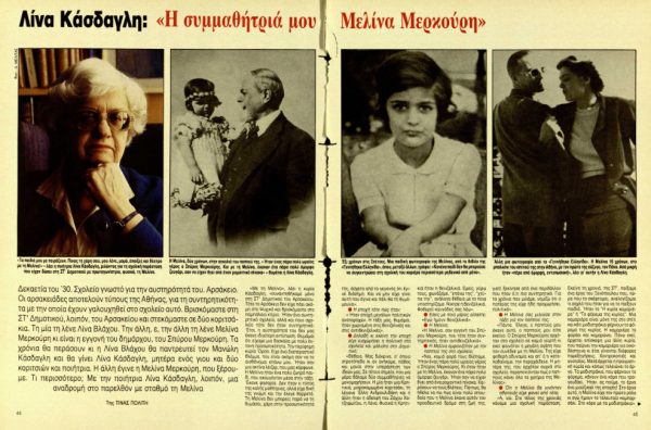 *Άρθρο της δημοσιογράφου Τίνας Πολίτη (1945-2000), που έφερε τον τίτλο «Λίνα Κάσδαγλη: Η συμμαθήτριά μου Μελίνα Μερκούρη» και είχε δημοσιευτεί στο τεύχος του «Ταχυδρόμου» που είχε κυκλοφορήσει στις 4 Ιουνίου 1987.