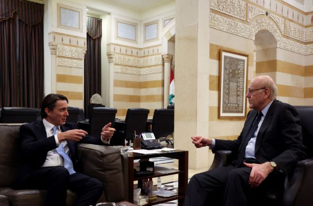 Οι έμμεσες συνομιλίες για τον τερματισμό των εχθροπραξιών κατά μήκος των συνόρων μεταξύ Λιβάνου και Ισραήλ θ’ αρχίσουν κατά τη διάρκεια του ιερού για τους μουσουλμάνους μήνα του Ραμαζανιού, που ξεκινά την ερχόμενη εβδομάδα, ανέφερε χθες Τρίτη ο υπηρεσιακός πρωθυπουργός του Λιβάνου Νατζίμπ Μικάτι (δεξιά, στη φωτογραφία του Reuters/Mohamed Azakir, επάνω, με τον αμερικανό απεσταλμένο Αμος Χοκστάιν στη Βηρυτό).