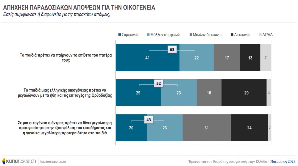 Ως προς τα δύο φύλα, ναι μεν η πλειοψηφία, εκτιμά ότι η απόκτηση παιδιού και η δημιουργία οικογένειας είναι το σημαντικότερο πράγμα όμως τα ποσοστά είναι διαφορετικά για παραδοσιακές απόψεις γύρω από την οικογένεια. Ως προς τα στερεότυπα, η κοινωνία έχει βαθιές ρίζες σε κάποιες παραδοχές όπως ότι θέλει τον άνδρα να εξασφαλίζει το εισόδημα και τη γυναίκα να δίνει προτεραιότητα στα παιδιά. Μόλις 35% των γυναικών συμφωνούν με τον εν λόγω διαχωρισμό, ενώ στην ερώτηση “σε μια οικογένεια ο άντρας πρέπει να δίνει μεγαλύτερη προτεραιότητα στην εξασφάλιση του εισοδήματος και η γυναίκα μεγαλύτερη προτεραιότητα στα παιδιά” μόνο το 43% συμφωνεί. Ως προς το αν τα παιδιά πρέπει να παίρνουν το επίθετο του πατέρα τους το ποσοστό ανέρχεται στο 63%.