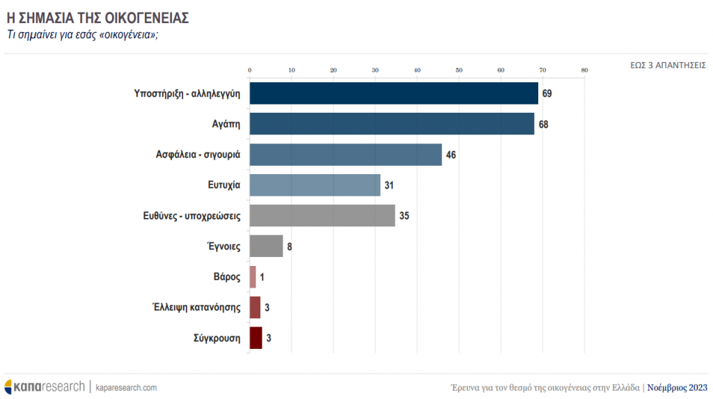 Τι σημαίνει, λοιπόν, οικογένεια; Σύμφωνα με την έρευνα το 69% απαντά Υποστήριξη – αλληλεγγύη, το 68% Αγάπη, ενώ ένα 35% απαντά Ευθύνες – υποχρεώσεις.