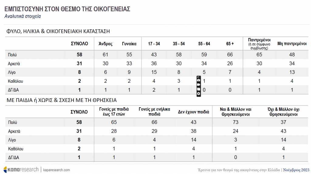 Δε συγκινεί ιδιαίτερα τις νεότερες γενιές το σύνθημα «Πατρίς-Θρησκεία-Οικογένεια», όμως η οικογένεια αποτελεί έναν πανίσχυρο θεσμό με υψηλά ποσοστά εμπιστοσύνης. Υπερβαίνει, σύμφωνα με έρευνα της Κάπα Research, το 89% σε άνδρες και γυναίκες, σε όλες τις ηλικιακές κατηγορίες, σε όσους έχουν κάνει ή δεν έχουν κάνει τις επιλογές γάμου/συμβίωσης και απόκτησης παιδιών, σε θρησκευόμενους και μη. Στους άνδρες η εμπιστοσύνη στο θεσμό φθάνει το 91% και στις γυναίκες το 88%. Μεγαλύτερη εμπιστοσύνη με 95% έχουν όσοι είναι ήδη παντρεμένοι – και με σύμφωνο συμβίωσης- ενώ όσοι δεν είναι έχουν μικρότερο εμπιστοσύνη συγκριτικά αλλά και πάλι σε υψηλό ποσοστό που φθάνει το 82%.