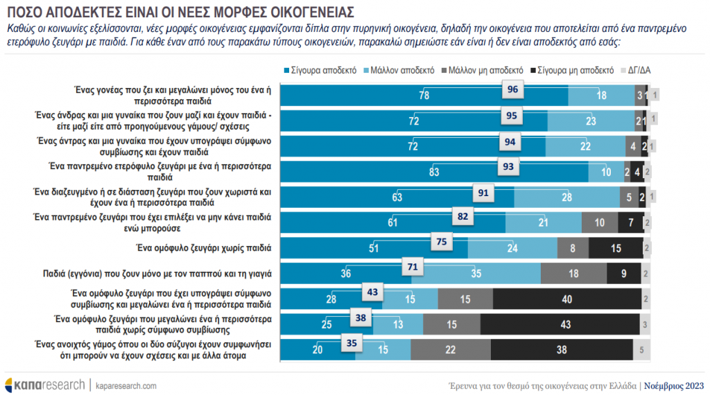 Πάντως, τα ομόφυλα ζευγάρια χωρίς παιδιά είναι αποδεκτά σε ποσοστό 75% ενώ οι μονογονεϊκές οικογένειες είναι αποδεκτές κατά 96%.
