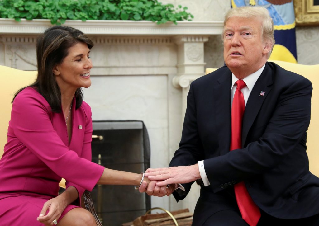 Όταν ο Ντόναλντ Τραμπ ήταν πρόεδρος των ΗΠΑ και η Νίκι Χέιλι πρέσβειρα στον ΟΗΕ, σε συνάντηση το 2018, στο Οβάλ Γραφείο του Λευκού Οίκου (REUTERS/Jonathan Ernst)