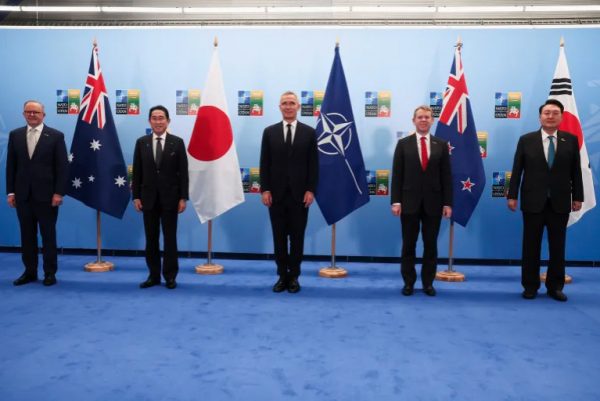 Η βορειοατλαντική συμμαχία έχει επεκτείνει τις δυνάμεις της στην Ανατολική Ασία, συγκροτώντας ένα ΝΑΤΟ «Ινδο-Ειρηνικού» (στη φωτογραφία του Reuters/Kacper Pempel, ηγέτες από την Ασία φωτογραφίζονται με τον Γενικό Γραμματέα του ΝΑΤΟ, Γενς Στόλτενμπεργκ)