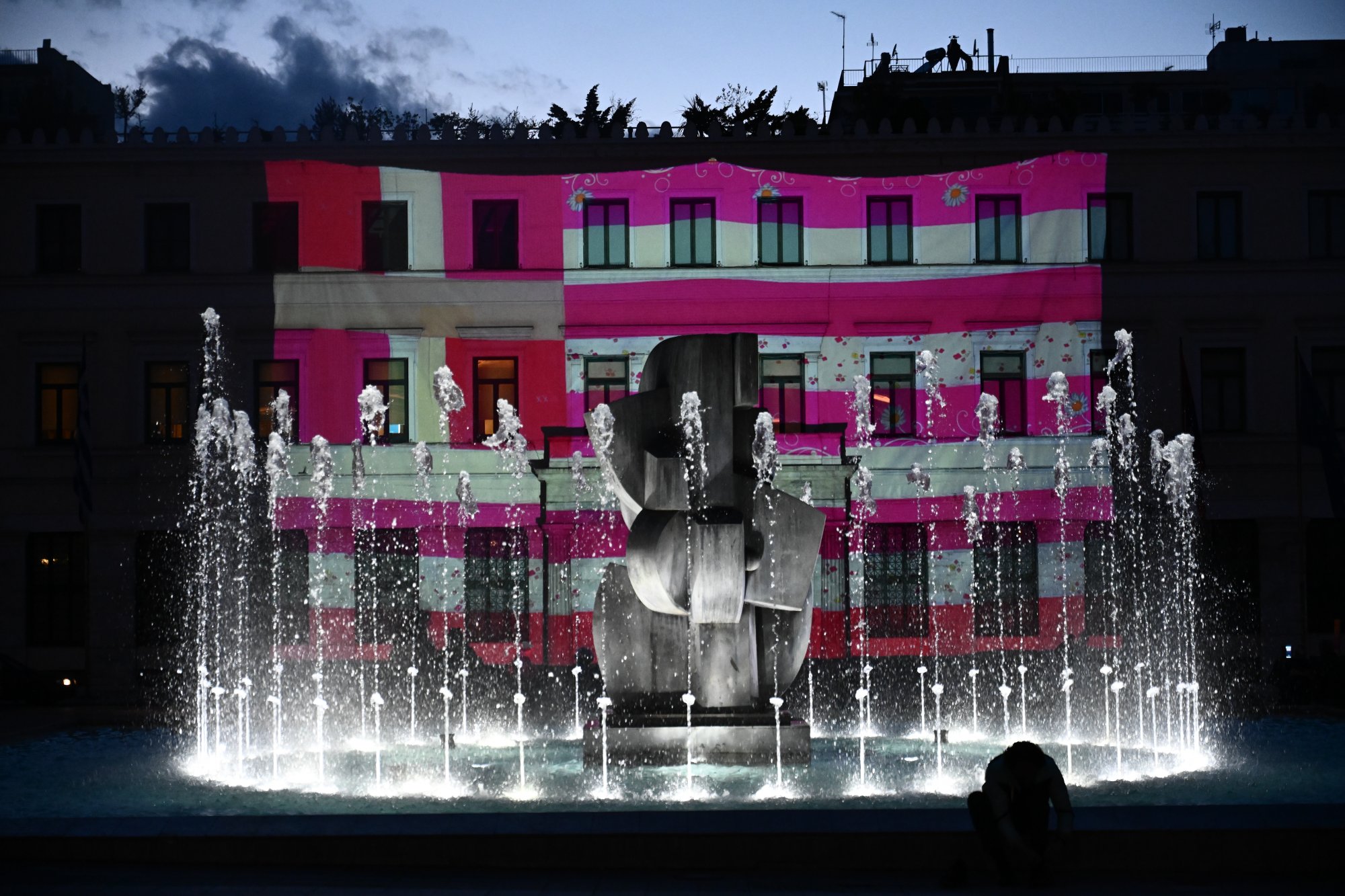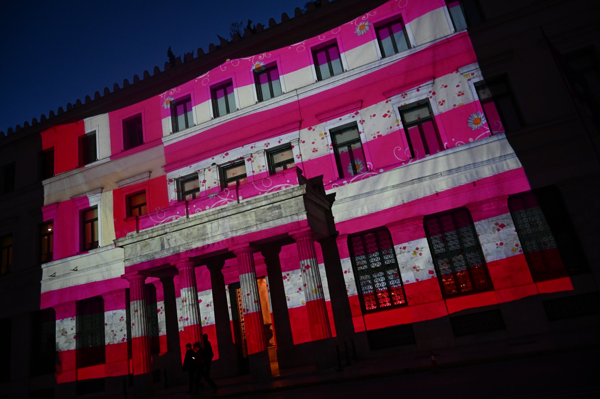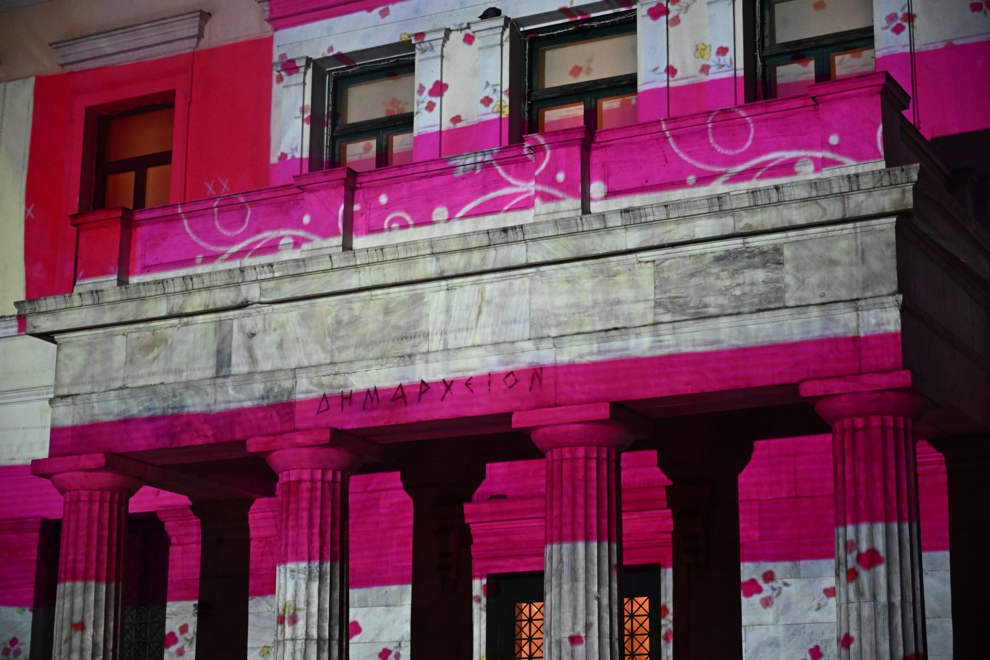 Το έργο τέχνης «Ενοχή της Γειτονιάς» (Neighborhood Guilt) της Γεωργίας Λαλέ «έντυσε» το δημαρχείο Αθηναίων στην πλατεία Κοραή, το βράδυ της 8ης Μάρτη, την Ημέρα της Γυναίκας.