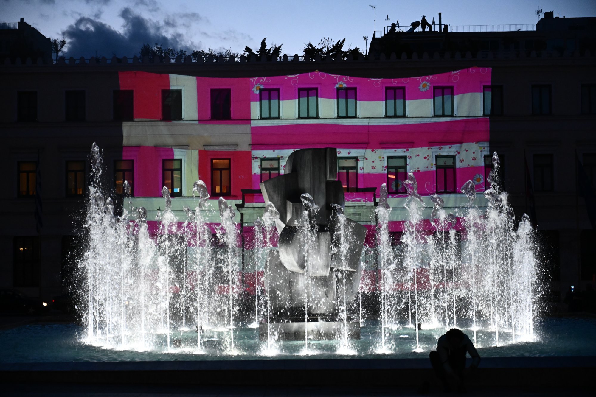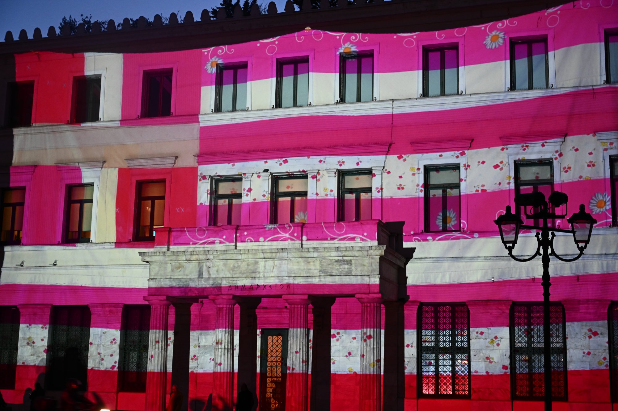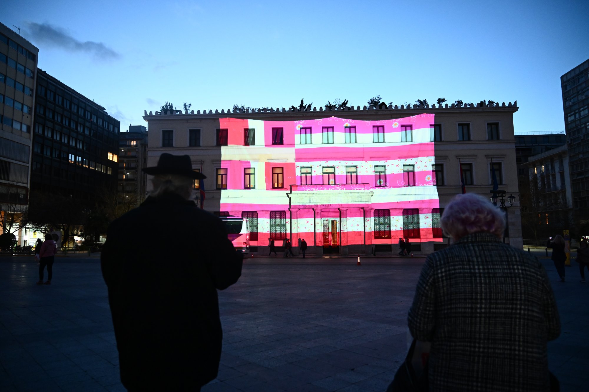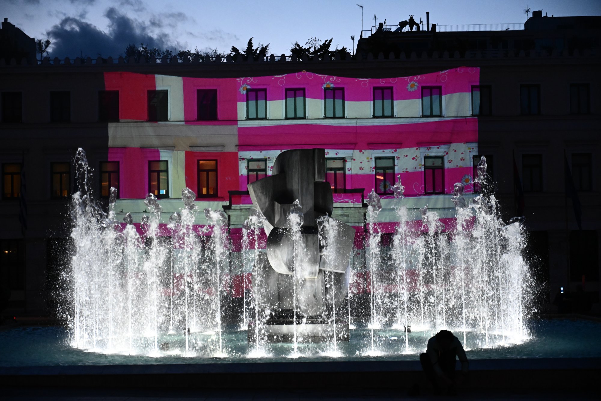 Το έργο τέχνης «Ενοχή της Γειτονιάς» (Neighborhood Guilt) της Γεωργίας Λαλέ «έντυσε» το δημαρχείο Αθηναίων στην πλατεία Κοραή, το βράδυ της 8ης Μάρτη, την Ημέρα της Γυναίκας.