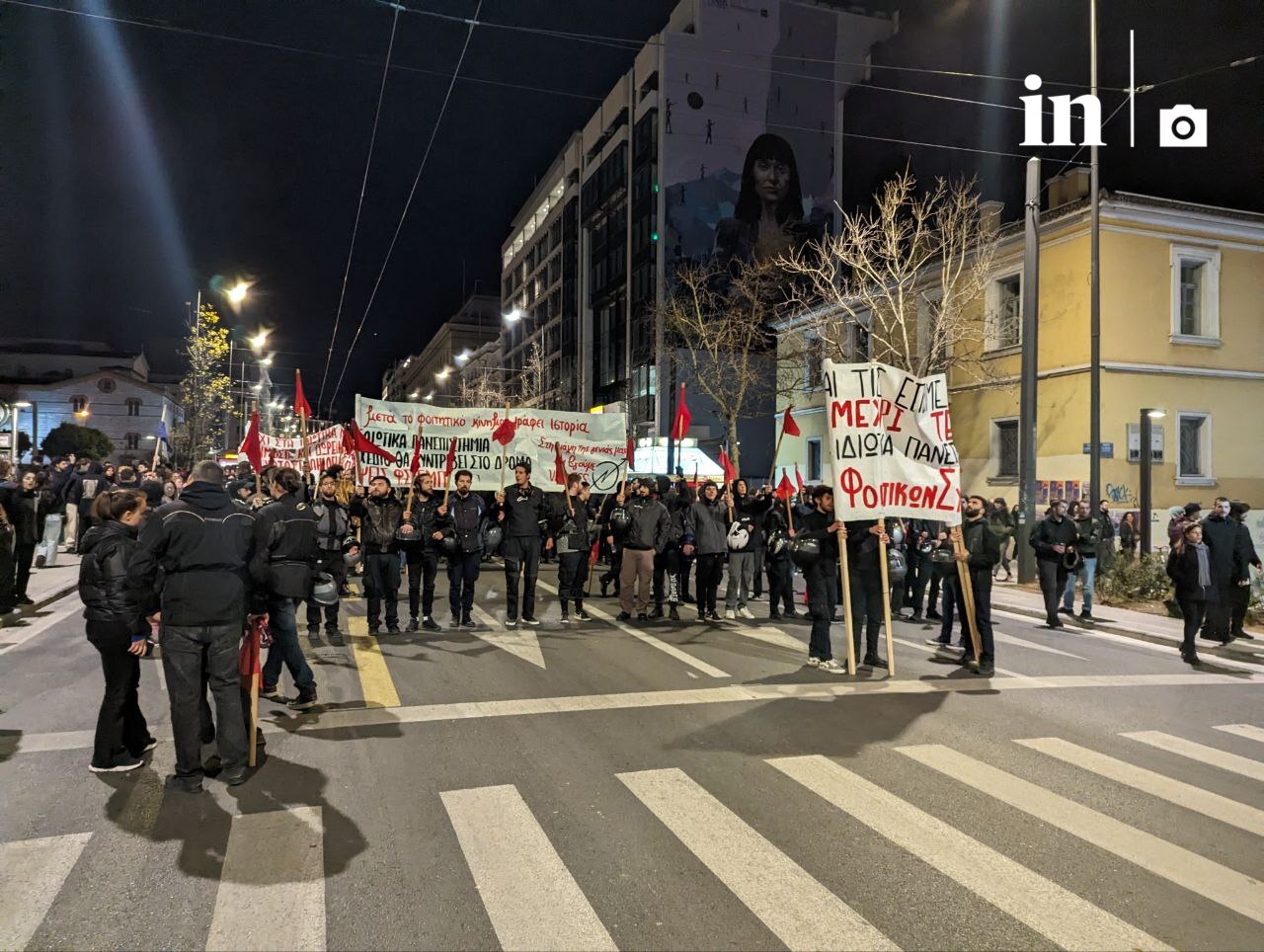 Η πορεία κόπηκε στη μέση και λίγο αργότερα τα μπλοκ ενώθηκαν και πάλι, συνεχίζοντας τη διαδρομή προς τη Βουλή.