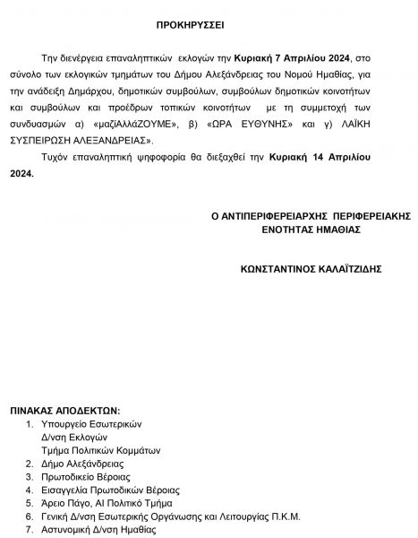 Τώρα είναι η ώρα του αγώνα. Καλούμε όλους τους πολίτες του Δήμου Αλεξάνδρειας να πιστέψουν στις δυνάμεις τους, να ενδυναμώσουν τον συνδυασμό μας και να αναγεννήσουμε όλοι μαζί την ελπίδα για τον τόπο μας. Ήλθε η ώρα!»