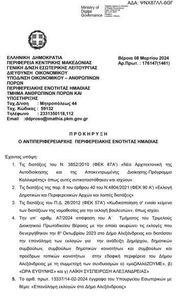 Με απόφαση του Τριμελούς Διοικητικού Πρωτοδικείου Βέροιας, κρίθηκε ότι ο συνδυασμός «Μαζί ΑλλάΖΟΥΜΕ» της Δώρας Κουρκουτά έπρεπε να είχε λάβει κανονικά μέρος στις αυτοδιοικητικές εκλογές του Δήμου Αλεξάνδρειας τον Οκτώβριο του 2023. Κάτι που είχε αναφέρει το in στις 11 Ιανουαρίου 2024 ως ένα βάσιμο σενάριο.