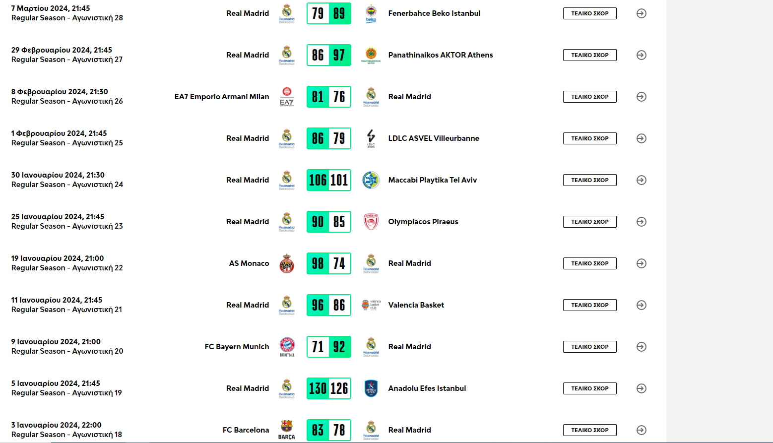 Αυτό όμως είναι το μικρότερο κακό που έχει υποστεί από τη Ρεάλ η ελληνική ομάδα, αφού ο Τσους Ματέο και οι παίκτες του έχουν κάνει 5 ήττες στο δεύτερο μισό και αυτές είναι από τις Μπαρτσελόνα, Μονακό, Αρμάνι Μιλάνο, Παναθηναϊκό και Φενέρμπαχτσε. Οι 4 εξ αυτών λοιπόν είναι οι ανταγωνιστές των ερυθρόλευκων στη «μάχη» της τετράδας, αλλά και της εξάδας και η Ρεάλ έχει καταφέρει να βάλει έξτρα εμπόδιο στους Πειραιώτες με τις ήττες που έκανε.