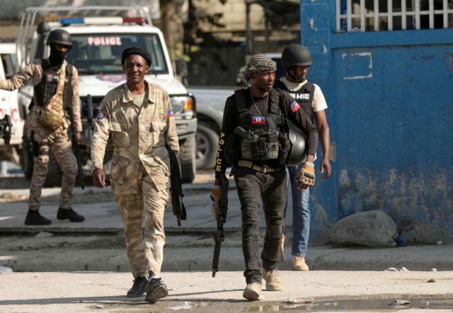Αναφορές για σφοδρά πυρά κοντά στο προεδρικό μέγαρο της Αϊτής μεταδίδει το πρακτορείο ειδήσεων EFE, καθώς η χώρα της Καραϊβικής συγκλονίζεται από κύμα βίας που κλιμακώθηκε ραγδαία εν τη απουσία του πρωθυπουργού Αριέλ Ανρί (στη φωτογραφία του Reuters/Ralph Tedy Erol, επάνω, αστυνομικοί περιπολούν έξω από το αρχηγείο της αστυνομίας στην πρωτεύουσα Πορτ-ο-Πρενς).