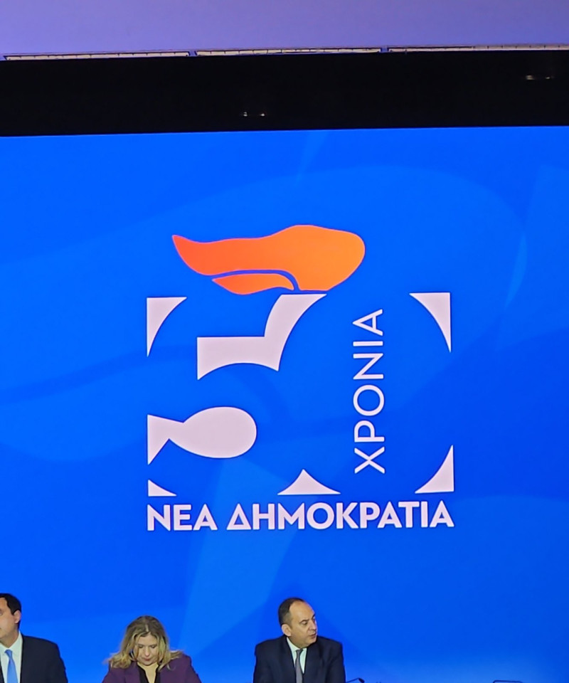 Μιλώντας στο προσυνέδριο της Νέας Δημοκρατίας, ο πρωθυπουργός και πρόεδρος της ΝΔ παρουσίασε το επετειακό λογότυπο με την χαρακτηριστική φλόγα του πυρσού, του πρώτου εμβλήματος του κόμματος, «να δίνει τον τόνο», ενώ από κάτω αναγράφεται «50 χρόνια Νέα Δημοκρατία».