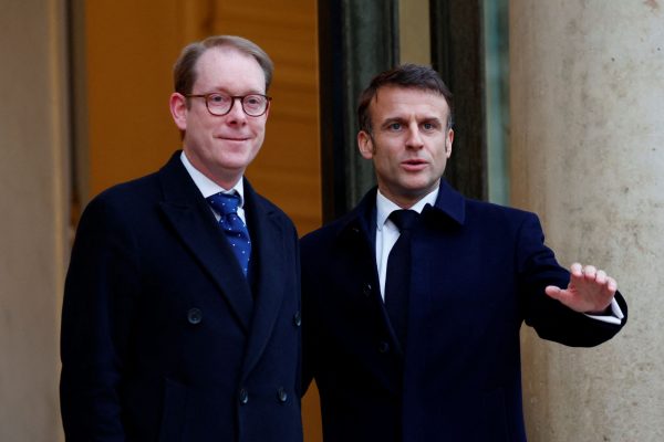 Ο Γάλλος πρόεδρος Εμανουέλ Μακρόν υποδέχεται τον υπουργό Εξωτερικών της Σουηδίας Τομπάιας Μπίλστρομ κατά την άφιξή του για να συμμετάσχει σε διάσκεψη για την υποστήριξη της Ουκρανίας με Ευρωπαίους ηγέτες και κυβερνητικούς εκπροσώπους στο Μέγαρο των Ηλυσίων στο Παρίσι στις 26 Φεβρουαρίου 2024.