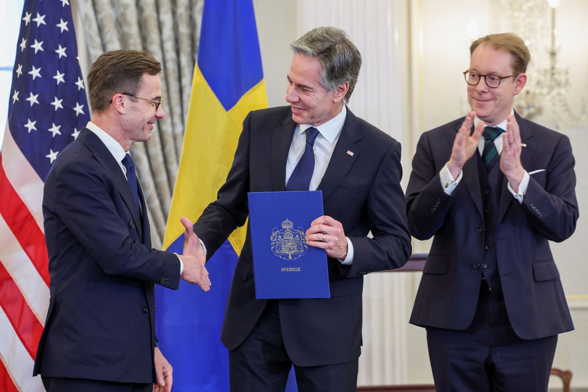 «Επιστρέψαμε στο σπίτι μας, στο σπίτι της συμμαχίας για την ειρήνη και την ελευθερία, στην οποία ανήκουν ήδη τόσες πολλές δημοκρατίες», δήλωσε ο πρωθυπουργός Ουλφ Κρίστερσον στους δημοσιογράφους πριν από την έπαρση της σημαίας της Σουηδίας.
