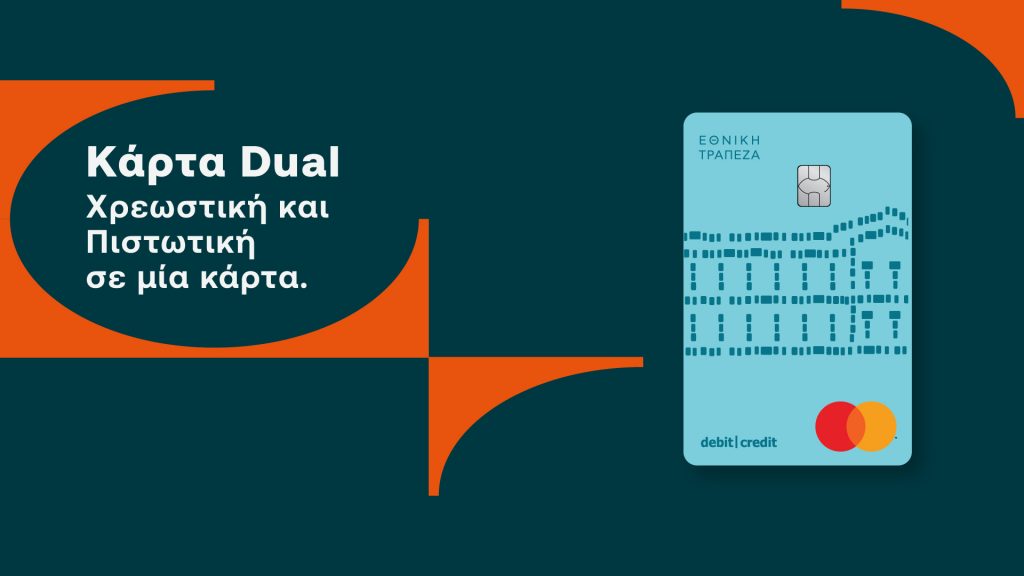 Το βασικό χαρακτηριστικό που κάνει την νέα κάρτα Dual να ξεχωρίζει είναι πως αποτελεί την πρώτη κάρτα στην ελληνική τραπεζική αγορά, η οποία έχει παράλληλη χρεωστική και πιστωτική λειτουργικότητα. Με αυτόν τον τρόπο, σου δίνει μία ανεκτίμητη ελευθερία επιλογών αλλά και τον απόλυτο έλεγχο των συναλλαγών σου, ενώ συγχρόνως σου συστήνει την πελατοκεντρική φιλοσοφία που χαρακτηρίζει εν γένει την Εθνική Τράπεζα. Πρόκειται για μία κάρτα ειδικά σχεδιασμένη για να ανταποκρίνεται στις ανάγκες της σύγχρονης ζωής, μία κάρτα που μπορείς να χρησιμοποιείς για κάθε τύπο συναλλαγής, είτε για μία καθημερινή αγορά όπως τα ψώνια του σούπερ μάρκετ, είτε για κάτι πιο ιδιαίτερο, όπως η επένδυση σε μία οικιακή συσκευή ή ένα νέο έπιπλο.