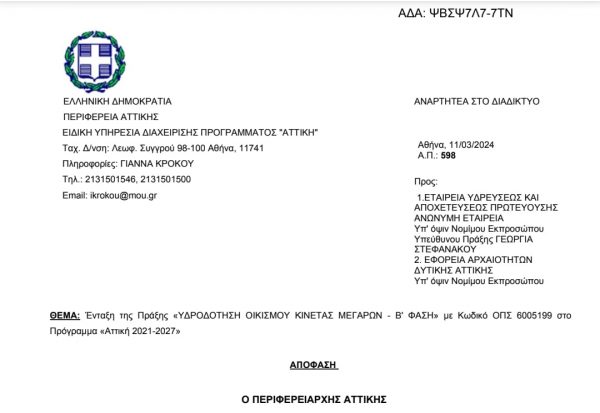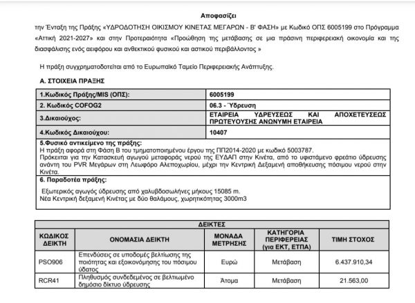 Στο Πρόγραμμα «Αττική 2021 – 2027» εντάσσεται με απόφαση του Περιφερειάρχη Αττικής το έργο υδροδότησης του οικισμού Κινέτας – Μεγάρων.