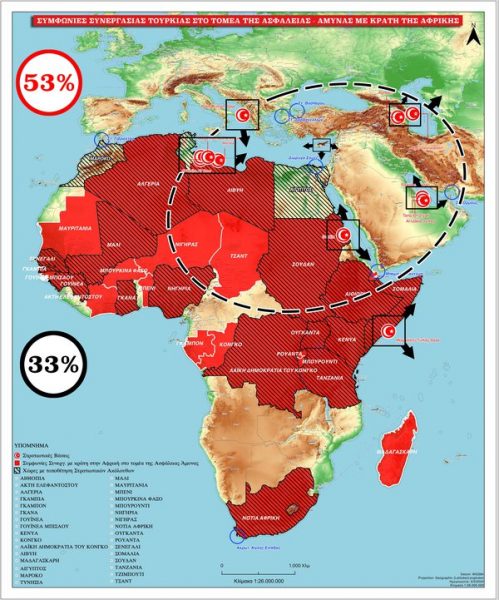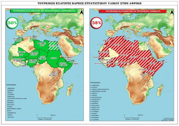 Ο διπλός χάρτης απεικονίζει αφενός μεν τις συμφωνίες της Τουρκίας με κράτη της Αφρικής για την πώληση μη επανδρωμένων αεροσκαφών και αφετέρου τις συμφωνίες για πώληση τροχοφόρων και ερπυστριοφόρων στρατιωτικών οχημάτων. Στην πρώτη περίπτωση, η Αγκυρα καλύπτει μια αγορά της τάξης του 50% των αφρικανικών κρατών και στη δεύτερη του 58%. Στη στρατηγική αυτή προστίθενται και οι στρατιωτικές βάσεις που έχει εγκαθιδρύσει στο Σουδάν, στη Σομαλία και στη Λιβύη, καθώς και οι συμφωνίες για την εκπαίδευση αξιωματικών και γενικότερα στρατεύσιμων σε διάφορες χώρες της μαύρης ηπείρου. Οι χάρτες αποτελούν αδιάψευστο μάρτυρα του ότι ο τουρκικός νεο-οθωμανισμός δεν είναι λόγια, αλλά πράξη