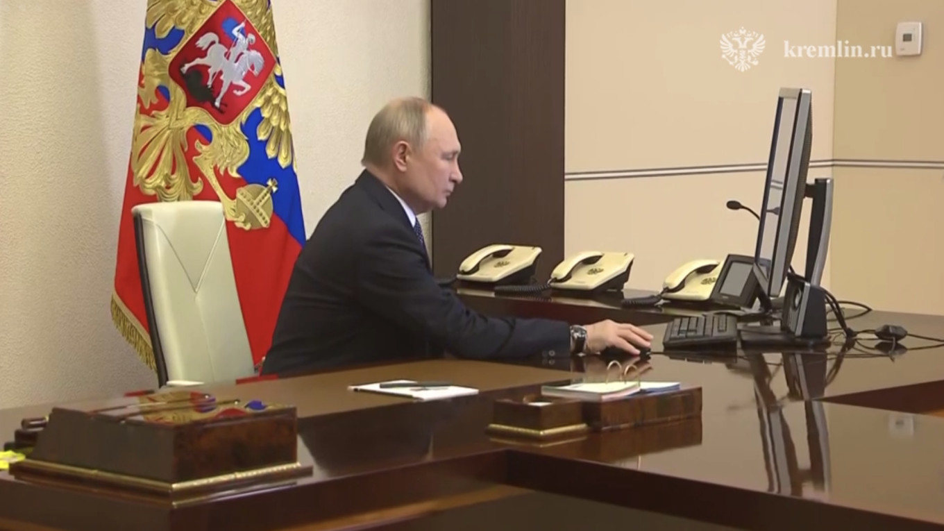 Στα πλάνα που μετέδωσε η ρωσική δημόσια τηλεόραση, ο Πούτιν κατευθύνεται σε ένα γραφείο και κάθεται μπροστά σε έναν ηλεκτρονικό υπολογιστή, με φόντο δύο ρωσικές σημαίες.