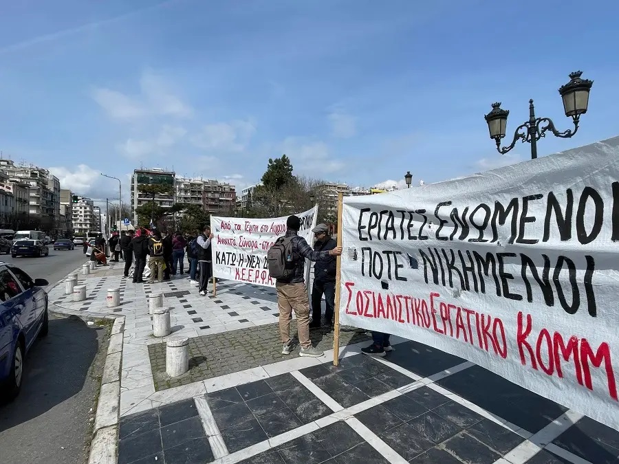 Οι συγκεντρωμένοι στη Θεσσαλονίκη πραγματοποίησαν αναφορά στις εργασιακές συνθήκες στην Ελλάδα και τόνισαν ότι στη χώρα κυριαρχούν η φτώχεια και οι χαμηλές αμοιβές στους εργαζομένους