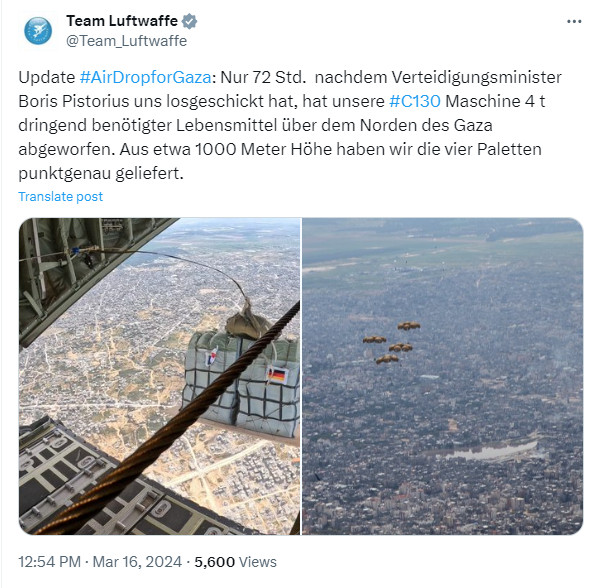 13:13 Η γερμανική πολεμική αεροπορία πραγματοποιεί την πρώτη ρίψη ανθρωπιστικής βοήθειας στη Γάζα