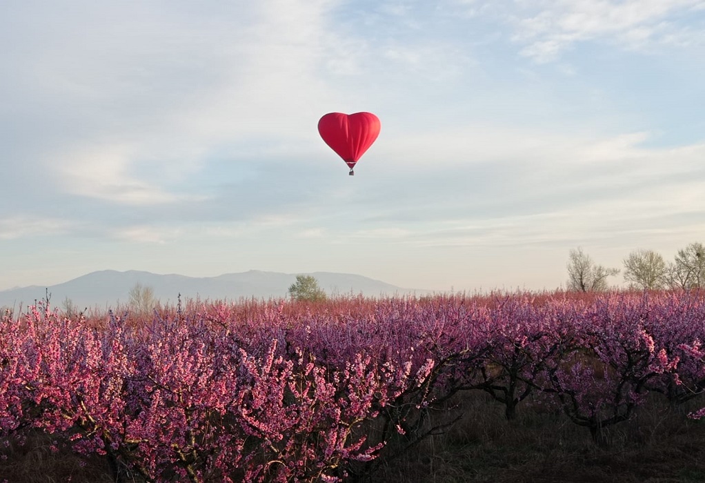 Τα αερόστατα που στόλισαν τον ουρανό της Βέροιας και ταξίδεψαν πάνω από τις ανθισμένες ροδακινιές σήμερα ήταν δύο: ένα λευκό και ένα σε σχήμα καρδιάς.