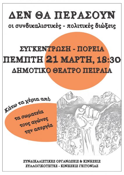 3 ποινικές διώξεις εκπαιδευτικών για την κινητοποίηση της ΕΛΜΕ Πειραιά ενάντια στη φιέστα-φιάσκο της ΔΔΕ Πειραιά υπέρ των ιδιωτικών σχολείων και για κινητοποιήσεις του Σωματείου στα γραφεία της ΔΔΕ Πειραιά. Σε αυτή την μήνυση που έγινε από τον ΔΔΕ Πειραιά διωκόμενος είναι επίσης ο πρόεδρος του Εργατικού Κέντρου Πειραιά που συμμετείχε και συμπαραστάθηκε στην κινητοποίηση.