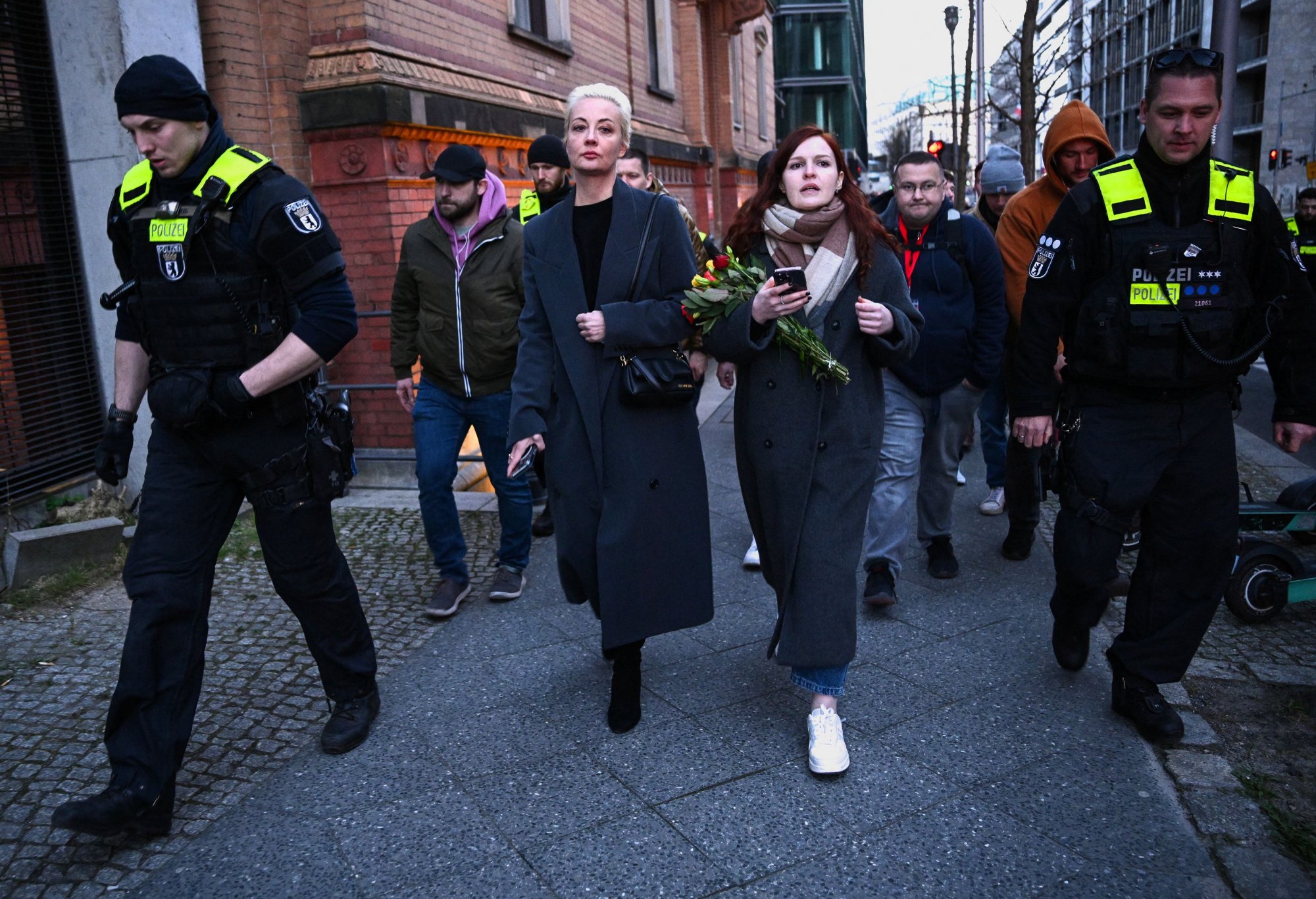 Αστυνομικοί περπατούν δίπλα στη Γιούλια Ναβάλναγια, τη χήρα του Αλεξέι Ναβάλνι, αφού έφυγε από τη ρωσική πρεσβεία στο Βερολίνο (Πηγή: REUTERS/Annegret Hilse)