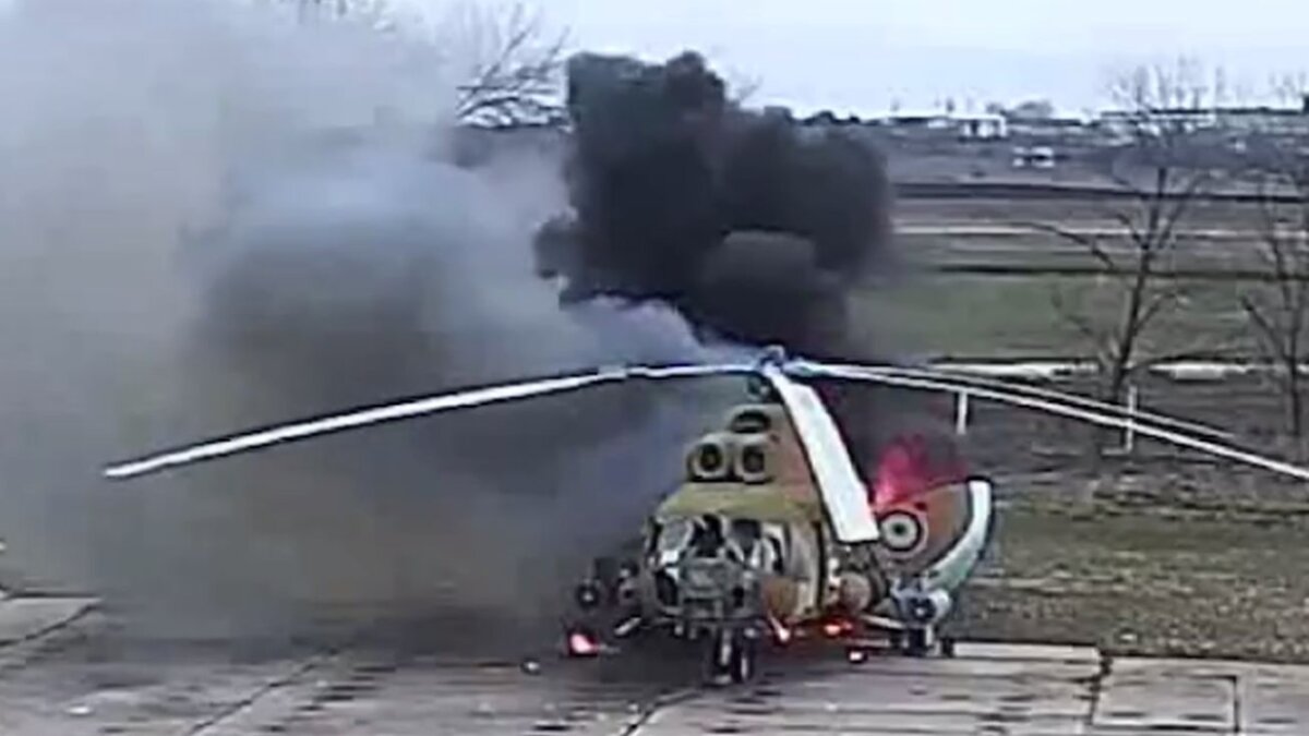 Η δημόσια τηλεόραση της Υπερδνειστερίας δημοσιοποίησε στον λογαριασμό της στο Telegram βίντεο από κλειστό κύκλωμα τηλεόρασης που δείχνει ένα βλήμα να πλήττει στρατιωτικό ελικόπτερο που εκρήγνυται και παίρνει φωτιά.