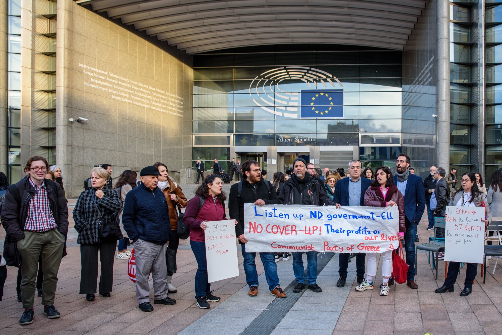 Οι συγκεντρωμένοι υποδέχτηκαν με χειροκροτήματα τους αντιπροσώπους του «Συλλόγου Πληγέντων του δυστυχήματος των Τεμπών» Μαρία Καρυστιανού και Παύλο Ασλανίδη κατά την έξοδο τους από το Ευρωκοινοβούλιο εκφράζοντας το αίτημα να μη συγκαλυφθεί το έγκλημα.