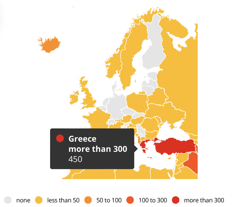Ο χάρτης δείχνει πόσες φορές χώρες στην Ευρώπη και στη Μεσόγειο έχουν σημειωθεί σεισμοί μεγέθους 4,5 βαθμών της κλίμακας Ρίχτερ ή παραπάνω από το 2012.