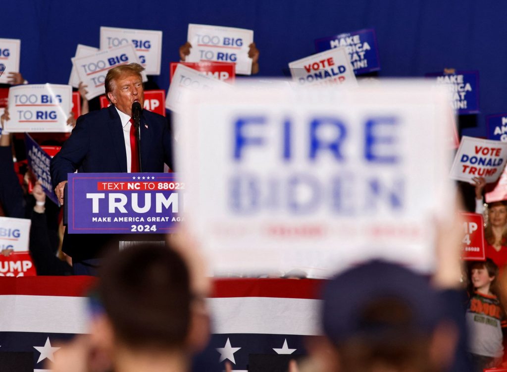 «Απολύστε τον Μπάιντεν» αναγράφεται στο πλακάτ, με φόντο τον Ντόναλντ Τραμπ στο βήμα προεκλογικής συγκέντρωσης στη Βόρεια Καρολίνα (REUTERS/Jonathan Drake)