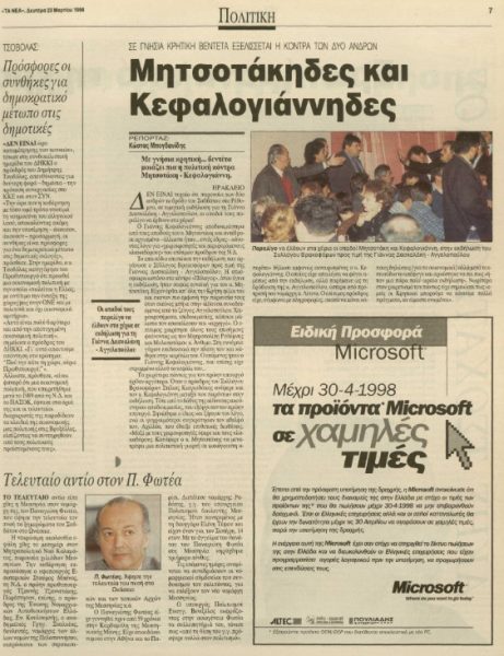 «ΤΑ ΝΕΑ», 23.3.1998, Ιστορικό Αρχείο «ΤΟ ΒΗΜΑ» & «ΤΑ ΝΕΑ»