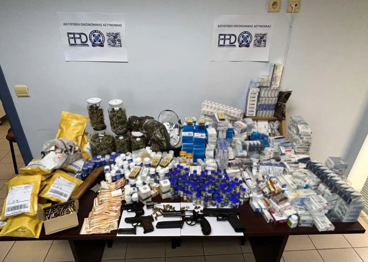 Κατασχέθηκαν, μεταξύ άλλων, περισσότερα από 22.000 δισκία αναβολικών ουσιών, 21 πακέτα με απαγορευμένα σκευάσματα, πλήθος ναρκωτικών δισκίων και 773 γραμμάρια κάνναβης.