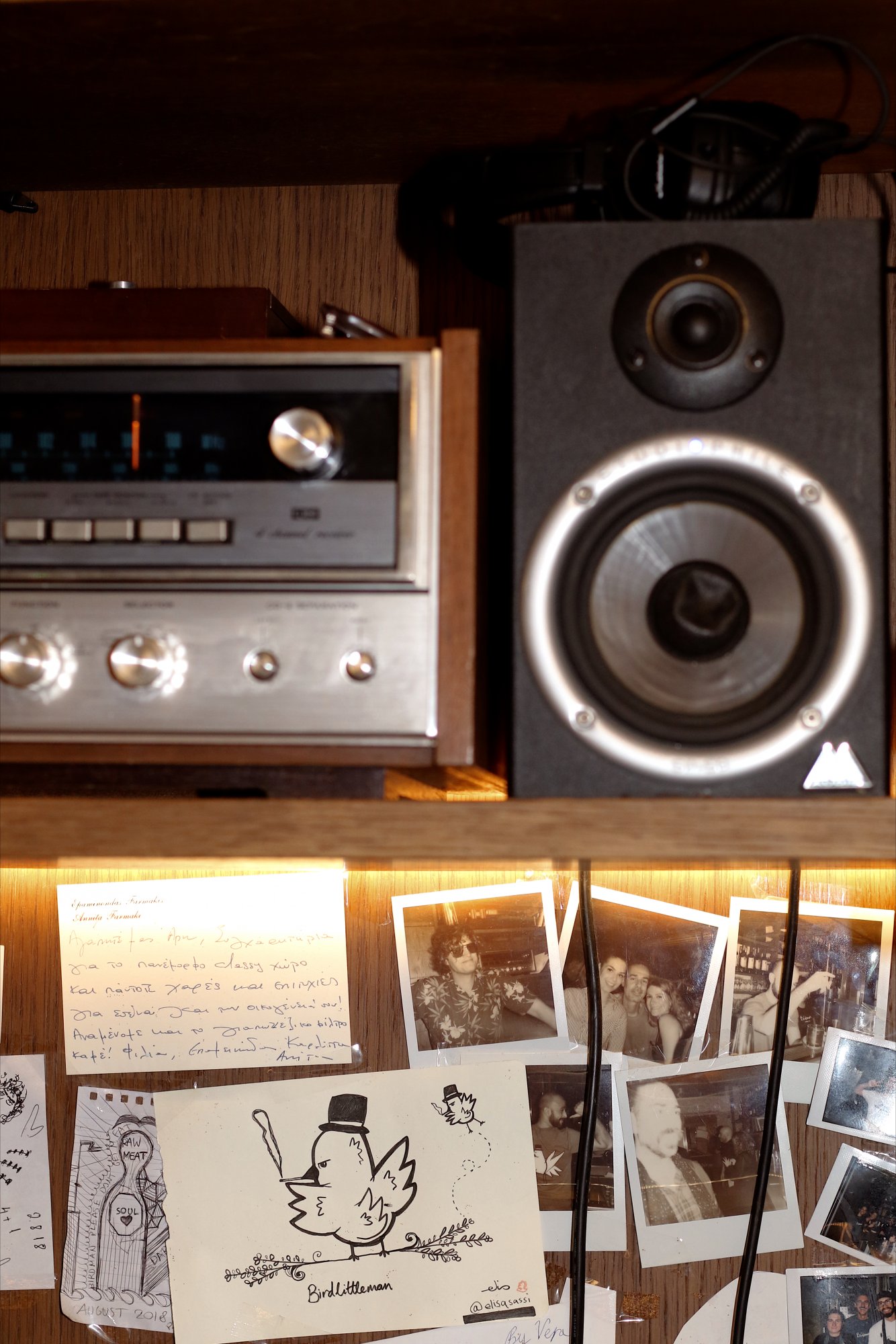 Χαρακτηριστικό των listening bars η μουσική από βινύλιο και ο άρτιος ηχητικός εξοπλισμός που μεγιστοποιεί την απόλαυση της ακρόασης: Ψαγμένα πικ-απ με πολύ ιδιαίτερες βελόνες και κατάλληλα ηχεία που εστιάζουν στην λεπτομέρεια του ήχου.