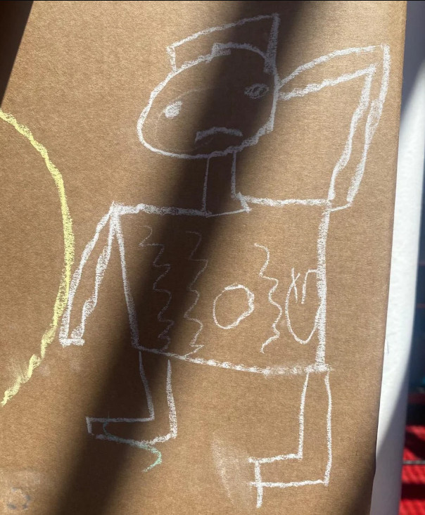 Εκείνη του έδωσε μία κιμωλία και διαπίστωσε ότι μπορούσε να γράψει. Η πρώτη εικόνα που ζωγράφισε ήταν ένα άτομο με λυπημένο πρόσωπο.